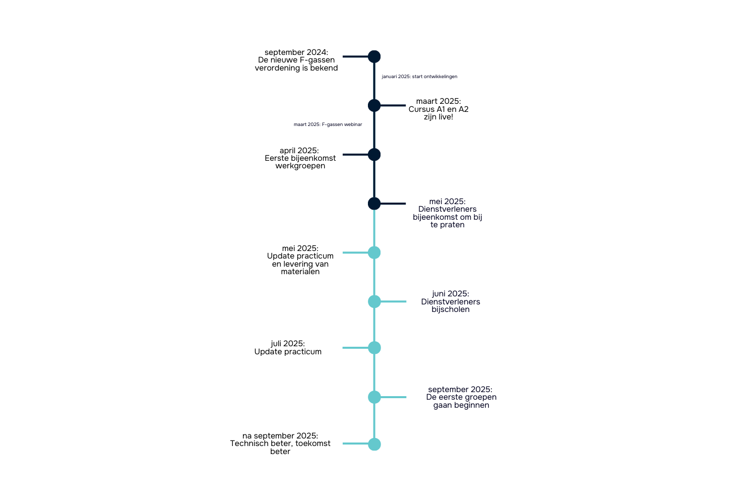 Onlangs zijn de cursussen F-gassen A1 en A2 ontwikkeld en gelanceerd om monteurs en installateurs in de koude- en klimaattechniek voor te bereiden op de nieuwste certificeringseisen. Deze praktijkgerichte cursussen biedt iedereen de nodige kennis en vaardigheden om veilig en efficiënt te werken met koudesystemen die F-gassen of koolwaterstoffen zoals propaan en isobutaan bevatten. - 1 januari 2025: Start ontwikkeling